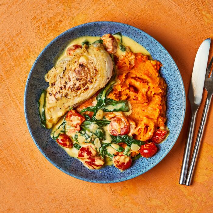 Take a taste adventure with our Chicken with Creamy Tomato Sauce recipe and Harissa Mash. Tender chicken, a rich tomato sauce, and mashed potatoes with a hint of Harissa come together in this delicious recipe. It’s the ideal balance of spice and comfort food, making it a tasty and straightforward supper. Prepare to wow your loved ones and your palate with this Gousto classic!